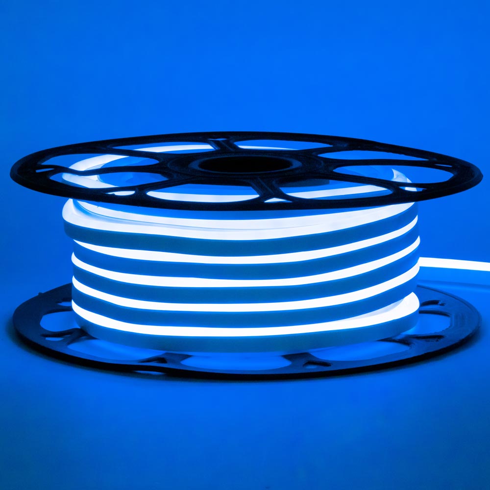 Легко сгибающийся синий (B) LED неон №53-B-АVT-1 NEON серии AVT-1 120 Led/m 7 Вт/м SMD2835 220V обладает сверх интенсивными светодиодами. Если есть желание его можно изгибать, поэтому он имеет возможность приобретать любые формы. Включать в одну цепь до 50 м ленты без употребления других блоков питания и усилителей делает неон комфортным и практичным.
